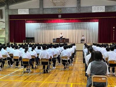 7月15日(火)6校時に、体育館にて薬物乱用防止教室が開催されました。当日は、気仙沼警察署生活安全課の鈴木様、薬物乱用防止協会の平塚様を講師にお迎えし、御講話をいただきました。講話では、薬物の恐ろしさだけでなく、オーバードーズや闇バイト、ネット犯罪など、私たちの身近に潜むさまざまな危険についても触れられました。生徒たちは、自分の行動をしっかりとコントロールすることの大切さについて学ぶ、貴重な機会となりました。
