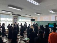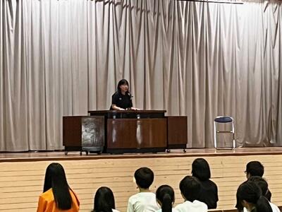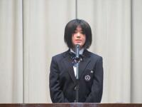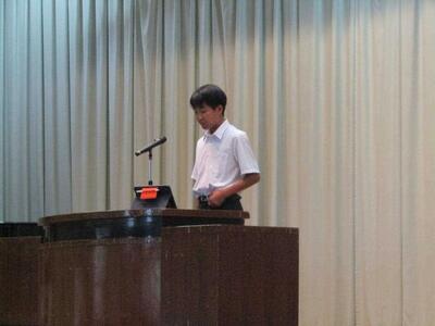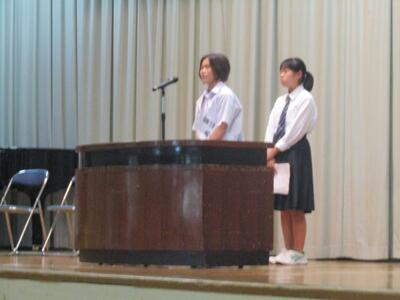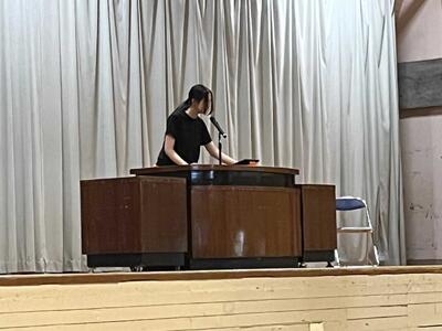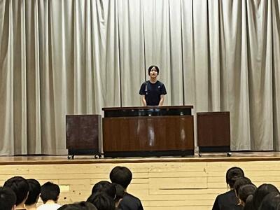 はじめに学校市長から全校生徒へ呼び掛けののち、その後、9月3日(水)に開催される英語暗唱・弁論大会に本校代表として出場する菊田珂子さん、横山葵さん、9月4日(木)に開催される少年の主張に出場する佐藤礼実さんが発表を行いました。