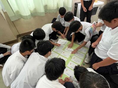 教室での活動では、大学生によるプレゼンテーション(勉強方法や中学校時代の夢など)の後、「ドリームビンゴ」(身近な目標を設定し、将来の指針とする活動)を行いました。