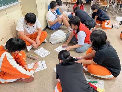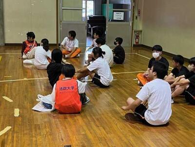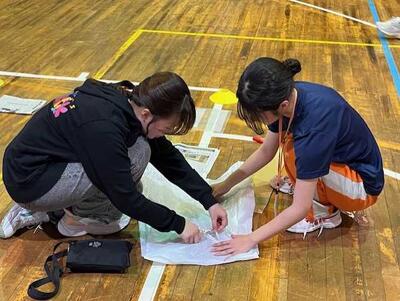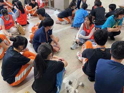 体育館での活動では、「クロスロード」(災害時におけるジレンマ性の高い問いを考え、参加者で意見を共有する)や、防災グッズリレーを実施しました。