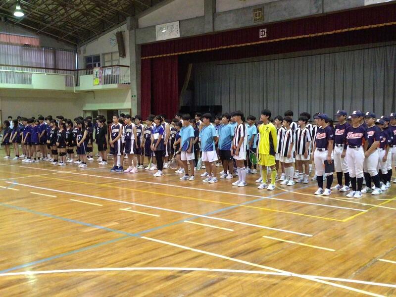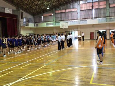 7月18日(金)、夏休み前集会が行われました。その後。7月19日(土)から開催される県中総体に出場する選手の壮行式、そして、この7月をもってアメリカへ帰国されるALTのマディー先生の離任式も実施されました。