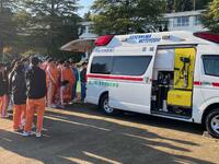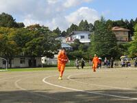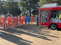 避難完了後には、煙道体験、水消火器を使った初期消火訓練、ポンプ車の見学を行いました。また、教職員による放水訓練も同時に実施しました。