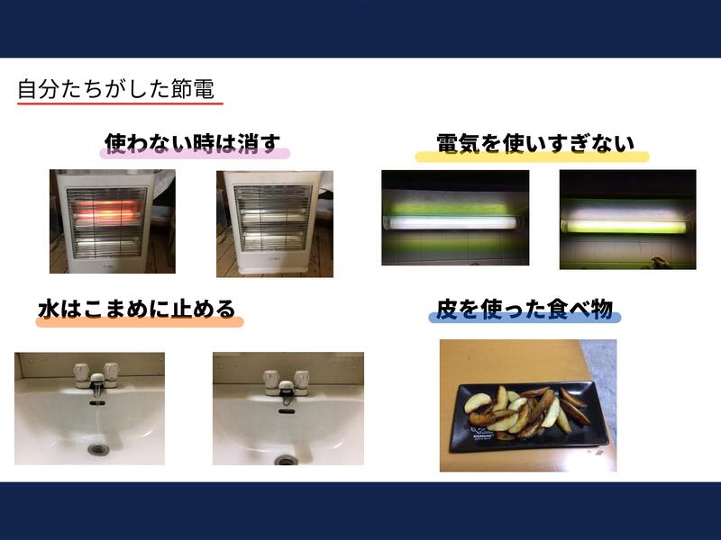 私たちが調べた結果、地球温暖化は確実に進んでいることが分かりました。温暖化を防ぐために、自分たちにできることとして、ゴミを出さないためにミニキエーロを作ったり皮のポテトチップスを作りました。