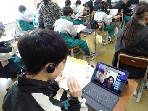 生徒一人ひとりがタブレットを活用し、外国人トレーナーと英文の音読を行ったり、内容に関する質問に答えたりしました。また、好きなことや行ってみたい場所について英語でやり取りするなど、回数を重ねるごとに各自のペースで会話を進めるようになってきました。