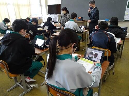 本校では、全学年を対象に、英語の授業の中でマンツーマンオンライン英会話(スパトレ)を実施しています。これは、気仙沼市教育パッケージ事業の一環として行っている取組です。