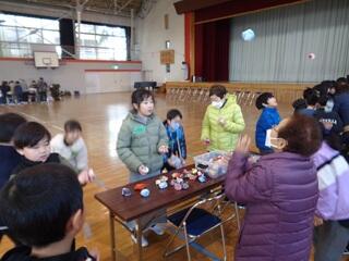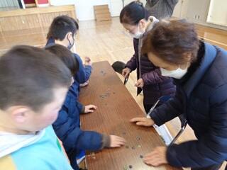 ・おはじき、お手玉、かるた、けん玉、コマ回し、紙鉄砲など、老人クラブの皆さんに遊び方や作り方を教えていただきながら、楽しく活動しました。お手玉が上手に出来るようになり、喜んでいた子もいました。