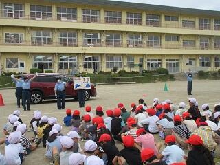 ・3年生の子供たちの「少年消防クラブ」入会式を行いました。今日は、バッチの贈呈、誓いの言葉の唱和等の入会式を行った後、「火事」についてのお話を聞きました。