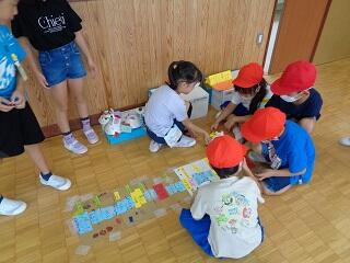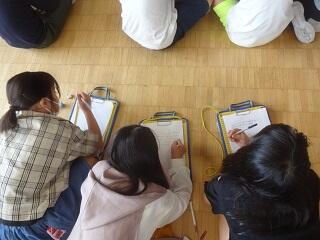 ・今日は、各班の顔合わせが中心でした。自己紹介等が終わった後、各班ごとにミニゲームを行いました。伝言ゲームや絵しりとり、じゃんけん陣取り、爆弾ゲームなど、短い時間で楽しめる活動を行っていました。