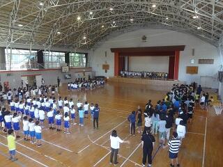 ・業前時間を使って、明日、市内の小学校を会場に行われる市内体育祭の壮行式を行いました。選手の子供たちは、やや緊張した面持ちでした。壮行式の最後に、全校でエールを送りました。