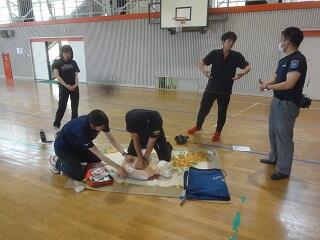 ・胸骨圧迫、気道の確保、AEDの使い方等について、グループごとに御指導いただきました。