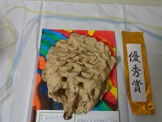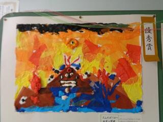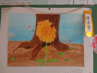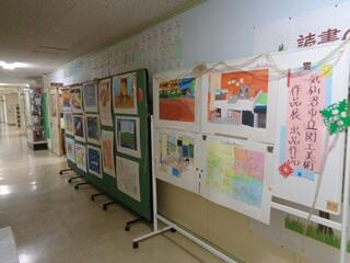 ・先日行われた市内図工展に出品したの作品を、校内で展示しています。いくつかの作品が優秀賞に選ばれました。子供たちも興味を持って見ており、次の作品制作への意欲につながっています。