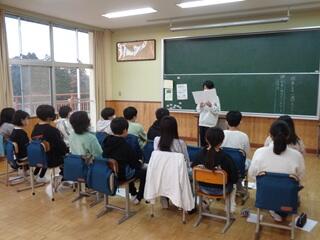 ・初めに先輩から中学校の学校生活について教えていただきました。その後、授業体験を行いました。子供たちは楽しそうに数学の授業を受けていました。