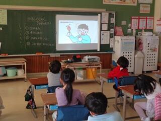 ・「松岩小むし歯マップ」を提示して、どの場所にむし歯が多いかや、正しい歯みがきの仕方等について映像資料を用いながら説明しました。保健室前には、子供たちの歯科に対する興味関心が高まるような掲示もしてあります。