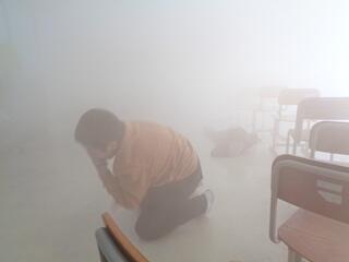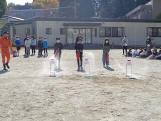 ・避難訓練後は、低学年はビデオでの火災予防学習、中学年は煙体験、高学年は水消火器での消火訓練を行いました。