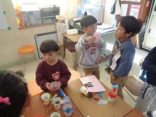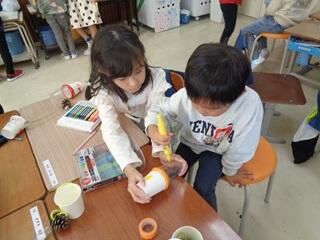 ・自分たちが生活科で作ったおもちゃの作り方を保育所の子供たちに教え、作ったおもちゃで楽しく遊びました。