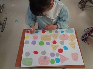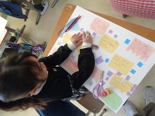 ・1年生が生活科の学習で、「自分すごろく」を作りました。1年間で自分ができるようになったこと、楽しかったことなどをポイントマスにしたすごろくです。ポイントマスに何を書くか考えながら楽ししそうに作成していました。
