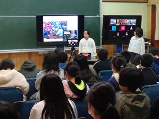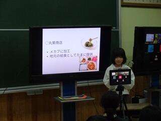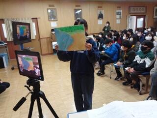 ・子供たちは、これまでの学習で学んだことをまとめ、オンラインで他校の子供たちに紹介しました。「海と生きる」未来を、一人一人が絵で表現し、代表児童が発表する場面もありました。