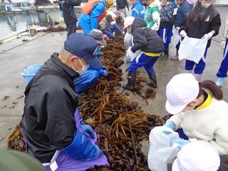 ・海の栄養が足りなく、例年に比べ、成長は半分くらいということでしたが、浅海漁業研究会のみなさんにお力添えをいただきながら、1本1本刈り取りをさせてもらいました。