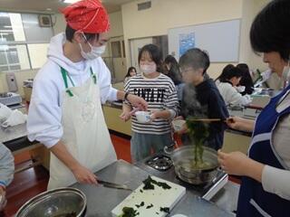 ・刈り取ったワカメの一部は、学校ですぐにゆで、ポン酢で食べました。子供たちは「おいしい、おいしい」と言いながら、何度もおかわりをしていました。海の恵みのありがたさを感じたことと思います。
