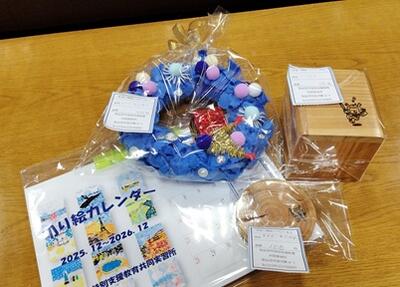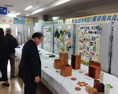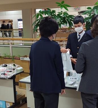 11月26日(水)ワンテンビルで行われた気仙沼市特別支援教育共同実習所の作品展・販売会に行ってきました。4月から講師の先生方と一緒に手芸班や木工班などに分かれて作業してきたすばらしい作品が,ワンテンビル2階にずらっと並べられました。各学校の先生方や市役所の皆さん,市民の皆さんがたくさん訪れ,生徒が販売員を務める販売会は賑わっていました。作品を両手いっぱいに購入する方もいらっしゃいました。私もリースやカレンダー,ペン立てなどを購入しました。校長室や職員室で大切に使いたいと思います。生徒は今日の販売会の売り上げをもとにして,調理実習に取り組む予定です。
