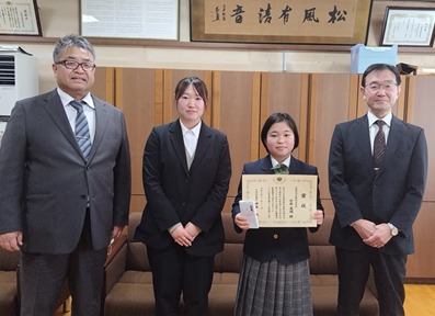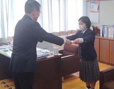 昼休みには,気仙沼税務署の署長様,総務課長様が来校されました。中学生の「税についての作文」で気仙沼税務署長賞に入賞した本校1年生菅原美陽さんに直接賞状をお渡しいただきました。「災害と税の関係についてしっかりと考えられた作品でした。」とお褒めの言葉をいただきました。