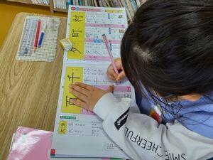 それが終わると書く練習です。「指書き→なぞり書き→写し書き」という順に練習します。上の写真のように先生と一緒にイチ・ニイ・サン・・・と声を出して筆順を確認しながら指書きをします。