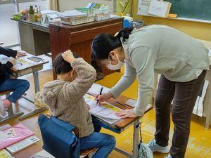 1年生は書き終えたら手を挙げ,先生に書いた文字を確認してもらうシステムのようです。M先生は,花丸を付けたり,さらに上手に書くためのアドバイスをしたりしながら一人一人の学びを見取っていきます。