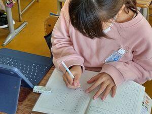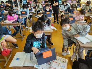 3校時,5年生は教室で社会科の授業でした。教科書下巻の初めの単元「くらしを支える工業生産」の学習です。覗いたときは,「機械工業」「化学工業」「繊維工業」など,いろいろな工業では,どんな製品を作っているのかを調べていました。