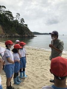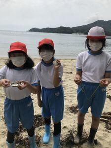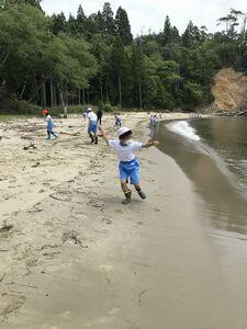 再び船に乗って森里海研究所の対岸へ。山道を通って九九鳴き浜へ移動しました。浜の名前の由来などの説明を聞いた後,貝殻やシーグラス探し,水切りなどをして楽しみました。