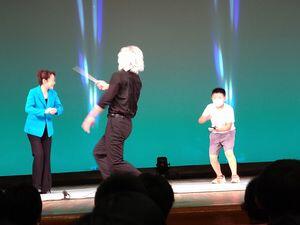 タップとパーカッションでの「トルコ行進曲」では,リーダーのポケさんから会場にお手伝いの演者の依頼がありました。選ばれてステージに上がったのが,4年生のT君。ベルで「トルコ行進曲」の重要部分を演奏しました。T君かっこよかったですよ。