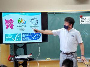 最も聞かせたかったのは,臼福本店がマグロ延縄漁業で世界で初めて認定されたMSC認証についてです。オリンピックの選手村で提供される水産物はMSC認証をうけたものしか使えないなど,子どもたちの興味を引き付けるようなトピックをいろいろと紹介してくださいました。
