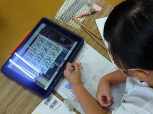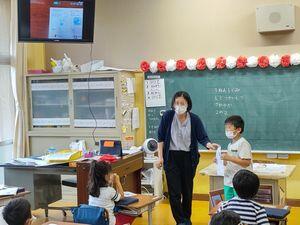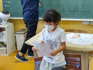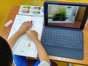 3校時,1年生では先週紹介した1年生単独の学校探検のまとめをしていました。1組は自分のタブレットで撮影した画像を基にして「発見した場所」のカードを書いていました。2組の方は書いたカードについて発表し,みんなで共有していました。