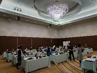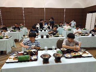 ホテル東鳳の夕食は、大きなシャンデリアのあるバンケットホールでとりました。お膳を覆う紙を取り、満面の笑みの男子。「校長先生、このご馳走の画像ください」とC君。