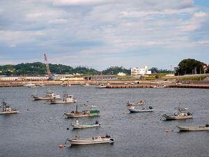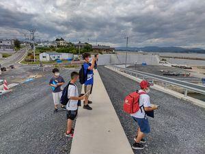 お話を聞いた後は,防潮堤に上がり,漁港の向こう側にあるウニの陸上飼育のプラントの建設予定地を確認していました。