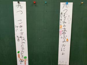 覗いてみると,「六つ ムーミン 遊ぶよ 六人」「九つ コアラがねている 九匹」などのカードを書いていました。数字の二つの読み方を入れ込んだ数え歌です。