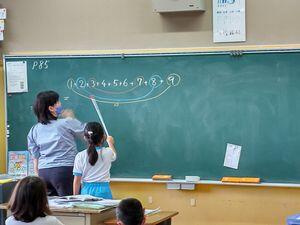 3校時,校舎を回ると2年2組では算数の勉強中でした。最初は昨日の学習の復習からです。1+2+3+4+5+6+7+8+9の計算を簡単にする方法についてです。1と9,2と8のように10の補数を組み合わせると45と簡単に計算できると,Rさんが考え方について発表しました。