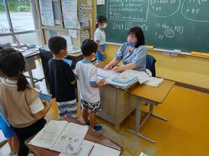8月から新しいALT(英語指導助手)がお出でになりました。RACHEL ELIZABETH BRAND先生,通称レイチェル先生です。4校時は3年1組の子どもたちと勉強をしていました。