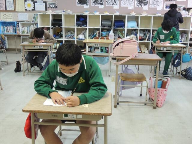 明日は、1年生から5年生までの今年最後の授業参観日です。保護者の皆様にご来校いただき、児童の成長した姿をご覧いただきたいと思います。本日は、2校時の様子をお伝えします。1年生は算数「たしざんとひきざん」、文章問題の分かっていることを見付けて、線を引いていました。2年生も算数「たし算とひき算」、まとめのテストに取り組んでいました。3年生は算数「三角形を調べよう」、自分たちで正三角形と二等辺三角形を作り、角度を調べていました。4年生は算数、2学期のまとめのテストに取り組んでいました。5年生は国語、共通する7つの資料から食品ロスを減らす方法について考え、発表していました。友達の発表の良い所を見付けて発表し合っていました。