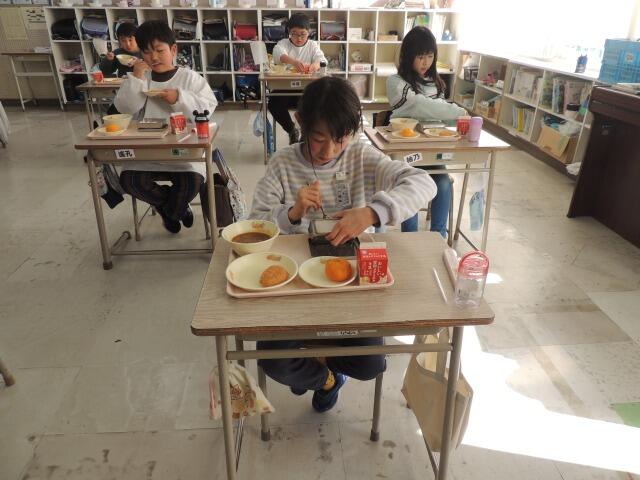 今日の給食は、エビカツ、チキンカレー、冷凍みかんです。今日は4年生の教室。職員室で冷凍みかんはシャリシャリしておいしい派と常温が一番派で盛り上がっていたので、「冷凍みかんは好き?」4年生に聞いてみると、「冷たくて苦手。」「前歯がキーンとします。」なんと知覚過敏の子がいました。隣の教室の3年生は「大好き!」という回答がほとんどでした。私は何十年ぶりかの冷凍みかんでした。
