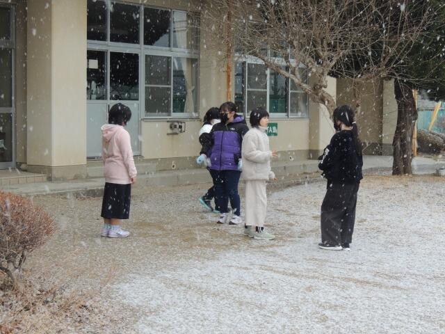 雪が本格的に降ってきました。今日は積もりそうです。3校時の様子をお伝えします。1・2年生は音楽です。1年生はこれまで習った曲を鍵盤ハーモニカで演奏していました。「日の丸」を上手に吹いていました。2年生も鍵盤ハーモニカですが、伴奏に挑戦していました。3年生は算数、2桁×2桁の筆算の仕方を考えていました。桁数も増えてきて、難しくなってきました。4年生は国語「ものの数え方を生み出そう」、いろいろなものの数え方を確認しながら、外国の子どものものの数え方について学習していました。ニンジンを「1本、2本・・・」と数えることって、外国人にとってはかなり難しいそうです。5・6年生は合同体育「タグラグビー」、準備運動で縄跳びに挑戦していました。さすが高学年、「後ろ二重跳び」も見事に跳んでいました。
