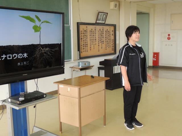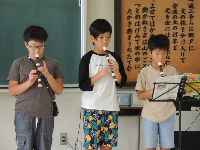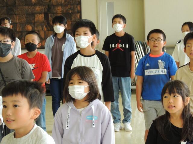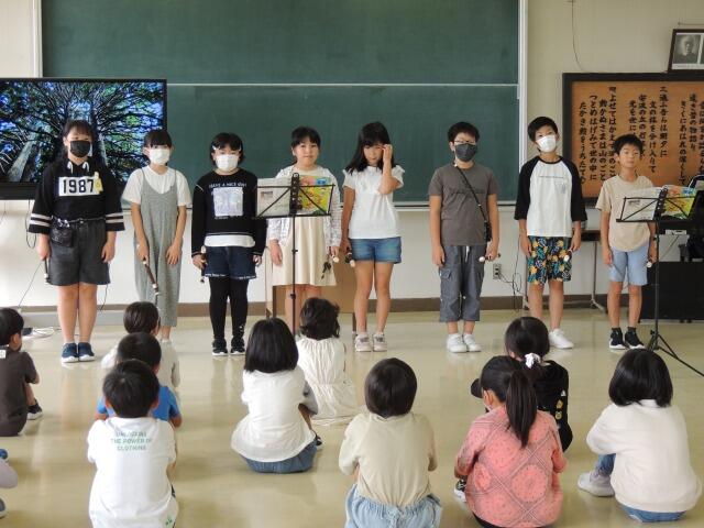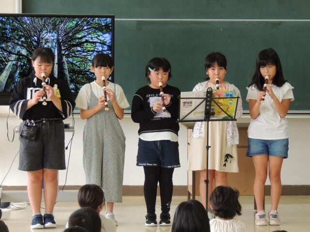 今朝の音楽朝会は学習発表会で全校合唱する「アスナロウの木」の歌を練習しました。本校卒業生の詩人 水上不二が作詞した歌です。1年ぶりの練習でしたが、綺麗な声で元気に歌えました。学年発表では、4年生がリコーダーで「オーラレイ」を綺麗な高音で演奏しました。他の学年の児童はうっとりとした表情で聴いていました。