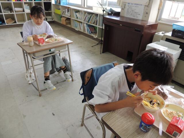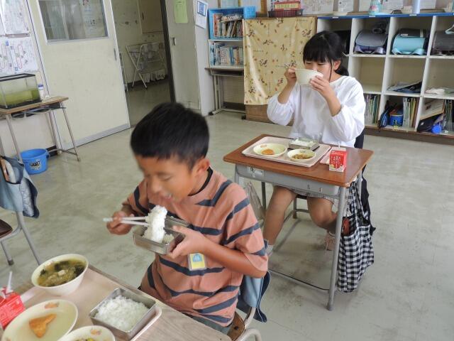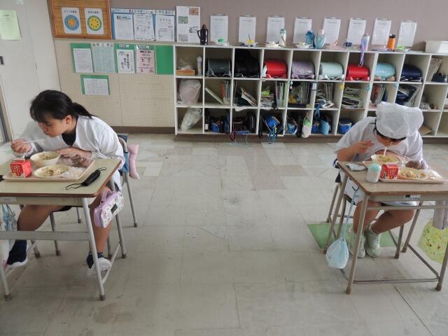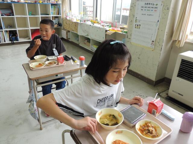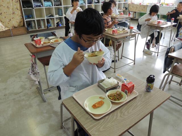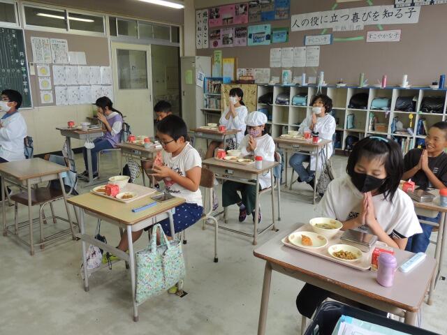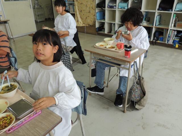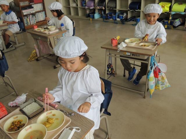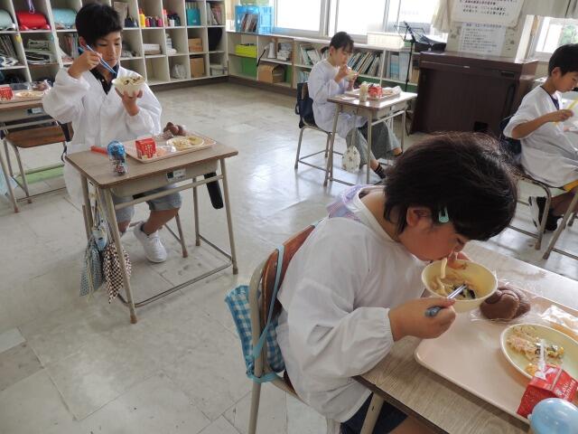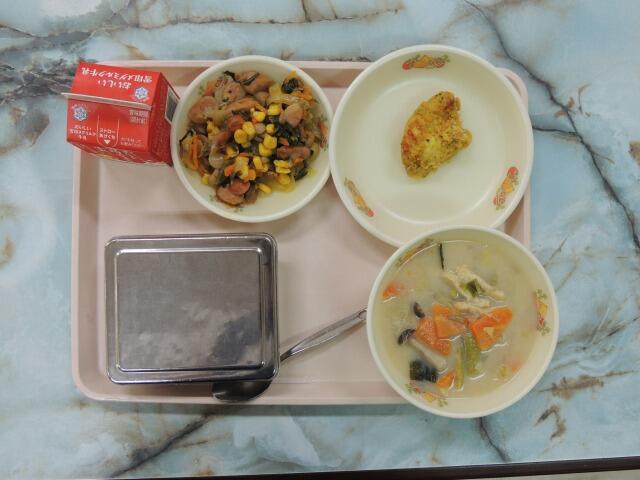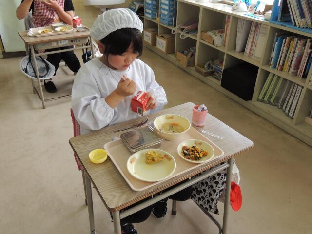 今日の給食は、鶏肉のカレーパン粉焼き、ほうれん草とコーンのソテー、豆乳スープです。今日は1・2年生の教室。久しぶりの給食をみんな笑顔で食べていました。