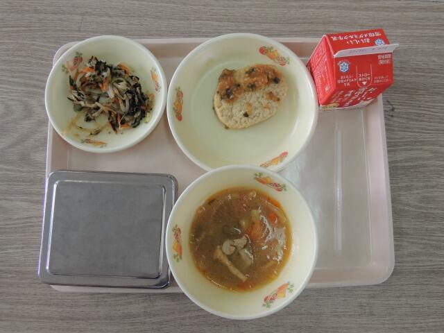 今日の給食は、和風おろし豆腐ハンバーグ、磯香和え、ピリ辛味噌汁です。今日は3年生の教室。「ピリ辛は大丈夫?」と尋ねると、「大好きです!」本校では、ピリ辛メニューは意外と人気なんです。