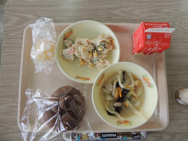 今日の給食は、ココアパン、ちゃんぽんうどん、レンコンサラダ、冷凍洋梨です。今日は4年生の教室。魚介類がたっぷりのちゃんぽんうどんにおかわりの列ができました。みんな、うどんに夢中です!