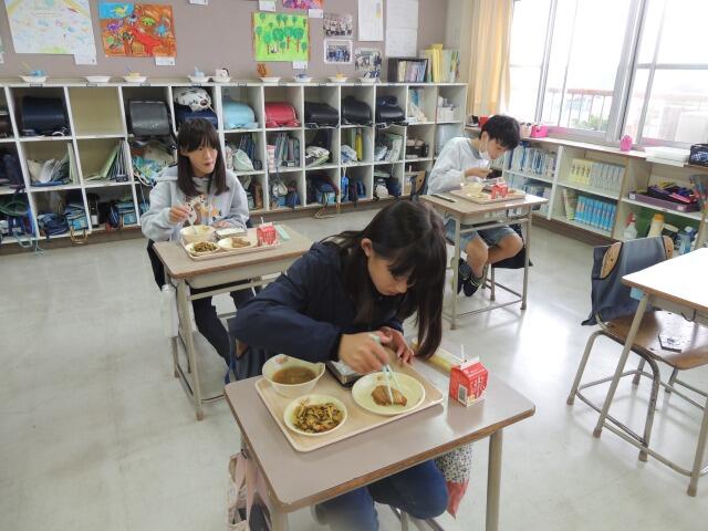 今日の給食は、ココアパン、花野菜サラダ、和風スパゲティ、ヨーグルトです。今日は2年生の教室。準備が始まったとたんにアクシデントが発生!お盆のうえのサラダを誤って落としてしまいました。すると、ペーパータオルを持った女子4人が、あっという間に片付け開始。その間、いつもと違うルートで配膳した給食を運び、いつも通りの時間で準備が終わりました。たくましい2年生です!