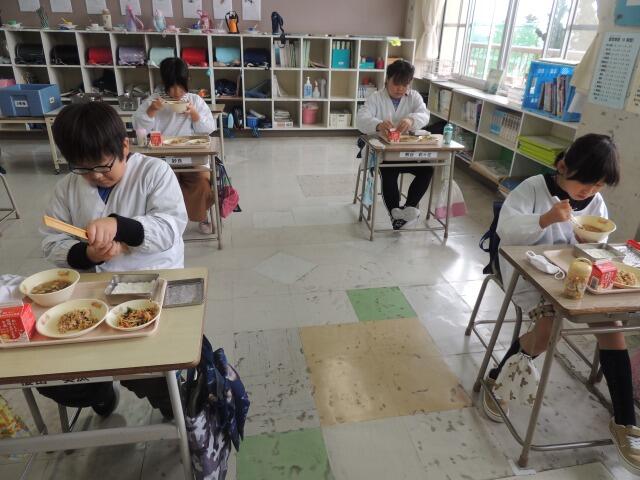 今日の給食は,肉味噌、ごま和え、気仙沼風おくずがけです。今日は3年生の教室。十八鳴浜探索で、ずいぶん歩いたので、おなかぺこぺこ。もりもり食べていました!