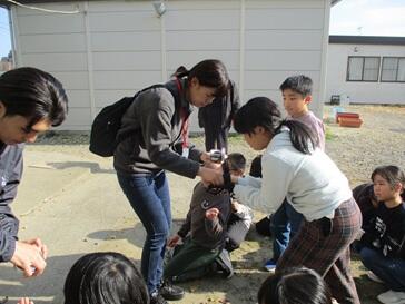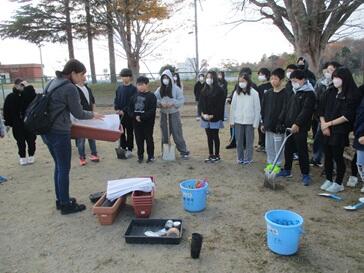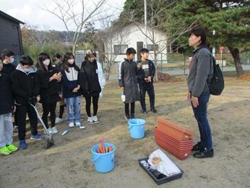 「浜わらす」の畠山さんの協力をいただき、5・6年生が海浜植物を未来につなぐ活動に取り組みました。講話をいただいたあとは外に出て、5年生は受け取った種が発芽しやすいように外殻を丁寧に削り、生命をつなぐための準備に取りかかりました。その間、6年生は植え付けを行う畑の整備に丁寧に取り組みました。