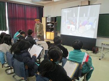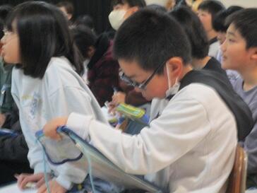 子どもたちはケンタロさんのお話を「遠く離れた島国の物語」としてなんとなく耳に入れるのではなく、近い将来、同じ島国である日本でも起きるかもしれない身近な問題として捉え、真剣な表情で受け止めていました。会場とした多目的室では、メモを取る鉛筆を走らせる子、前のめりになって資料やお話に夢中になる子の姿が多く見られました。普段あまり意識せずに行っている自分たちの小さな行動が、遠く離れたキリバス共和国の人たちにとっては国土が失われるような死活問題につながりかねない…。講話は驚きの連続でした。