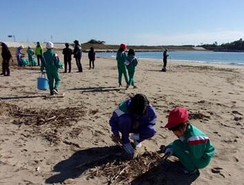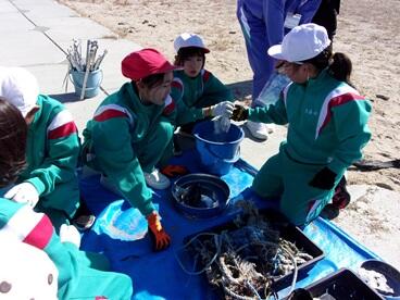 調査を進めるにあたり、子供たちはまず、砂浜に流れ着いたごみや誰かが放置してしまったごみを一生懸命に集めました。ペットボトルやプラスチック製品、漁網、なかには夏に仕事を終えたであろううちわまで。海岸には私たちが予想していた以上のたくさんのごみが散在していました。大きなごみや砂浜に埋まってしまっているごみを収集するために、汗を流して一生懸命頑張っている4年生の姿が目立ちました。ごみ集め(砂浜清掃)活動には職場体験で本校を訪問している中学生も加わり、地域の海の美しさを未来に残すための活動に全員が夢中になりました。