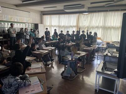 4年生は本日、先週実施した大谷海岸でのスナガニ調査の結果を、南三陸ネイチャーセンターの阿部拓三博士と一緒に考察し、自分たちの探究的な学びを一層深めることができました。拓三博士は20日(月)の調査で4年生の子供たちが発見したスナガニを研究施設に持ち帰り、1匹1匹大きさや雌雄を記録し、生まれてからどのくらいの年月が経過しているかを調べてくださったとのことです。講話を聞く4年生の子供たちの表情は真剣そのもので、メモを取る鉛筆もよく動いていました。